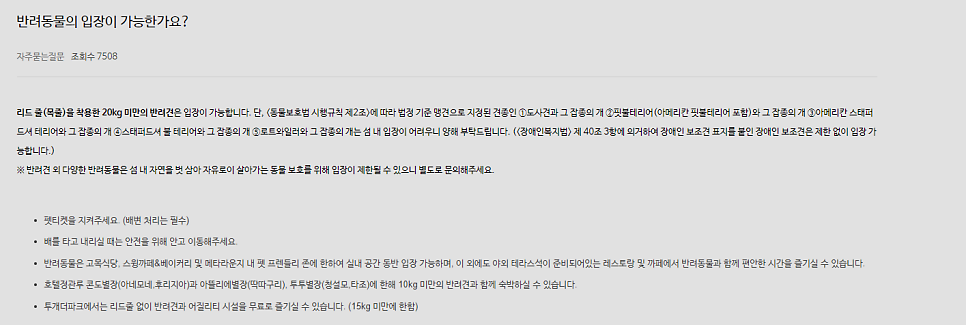 - 페리 탑승 또는 짚라인으로 입장: 반려견은 안고(또는 유모차, 이동가방) 동승 (짚라인은 반려견 불가)