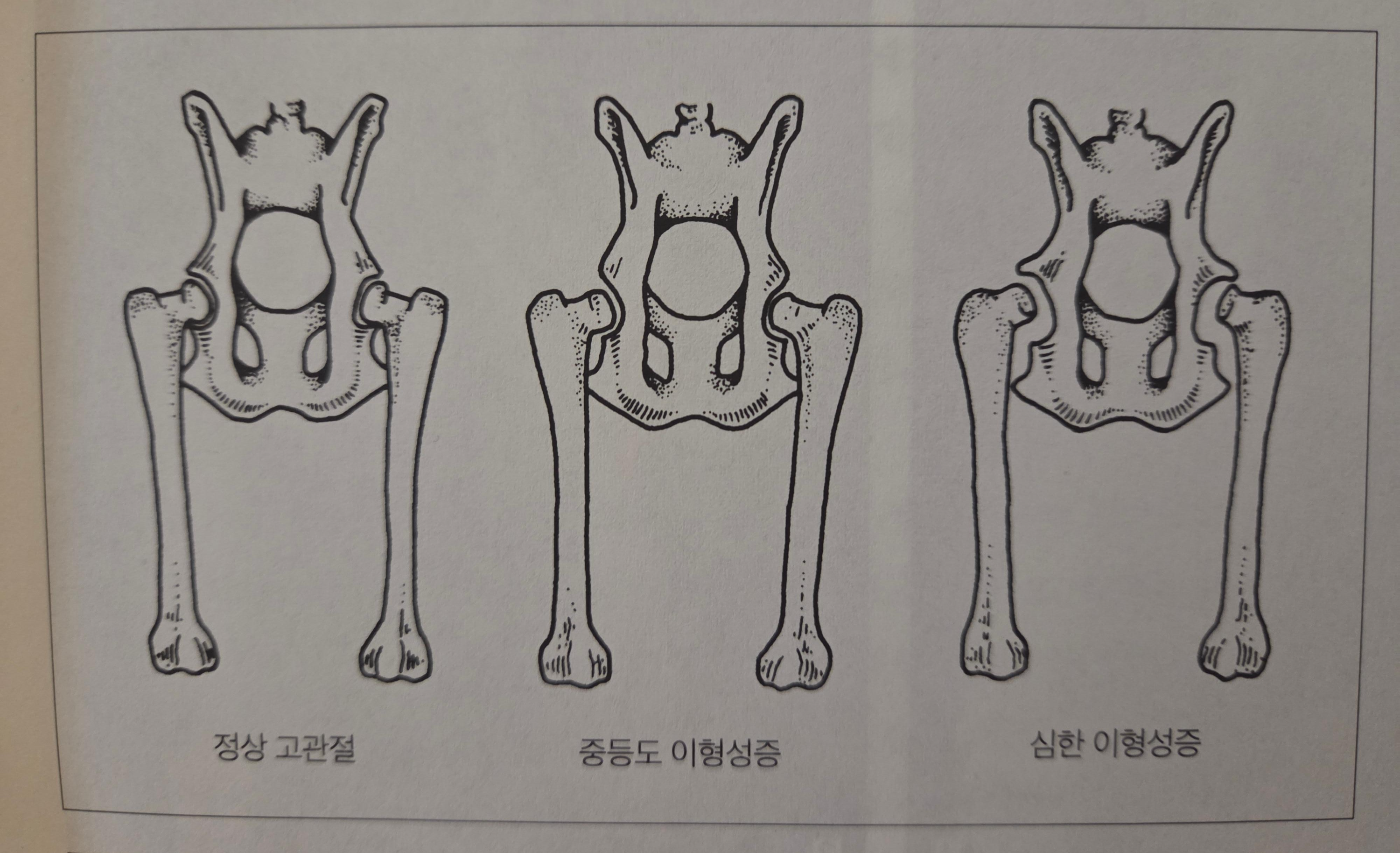 고관절은 공모양의 대퇴골머리(대퇴골두)와 움푹 파인 홈 모양의 골반 관골구가 관절을 이룹니다. 이형성증이 있는 고관절은 대퇴골(넓적다리뼈)의 머리부분이  얕은(발달이 제대로 안된) 관골구와 만나 딱 들어맞지 않고 느슨해지게 됩니다. 이러한 이유로 대 퇴골두가 관골구에서 정상범위를 벗어나 움직이게 되고, 비정상적으로 닳거나 찢어져 관절염 또는 염증으로 발전하여 반려견의 통증과 보행장애를 초래하게 됩니다.